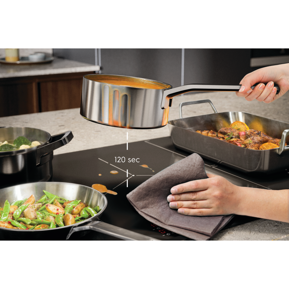 La Bridge 6000 permet sans problème de cuire dans les grands récipients. Le bouton Bridge permet de relier deux zones de cuisson sur deux côtés de la table pour accepter n’importe quelle taille de récipient. La nouvelle zone a les mêmes réglages de température et de temps de cuisson.