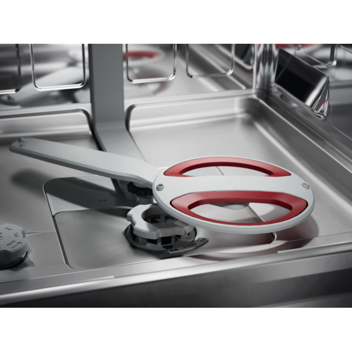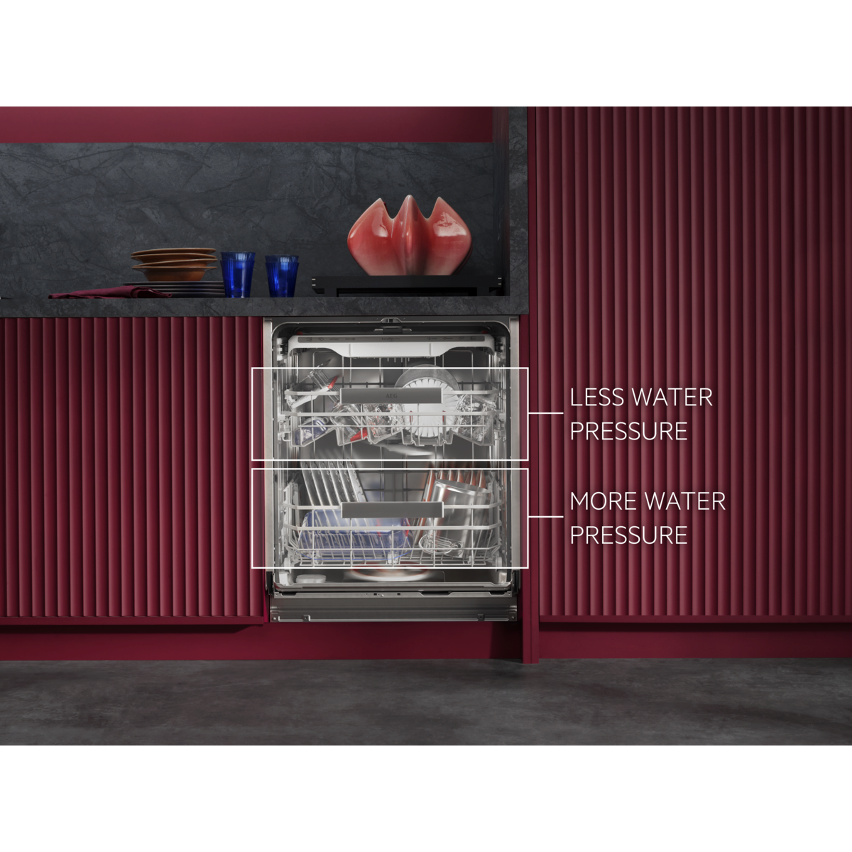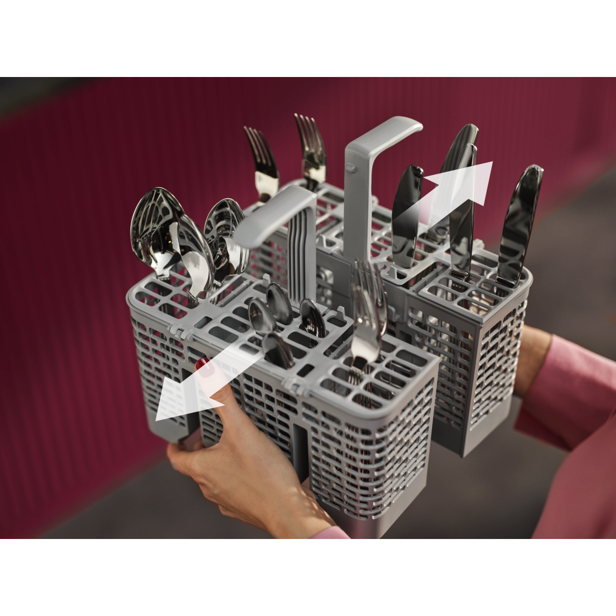 Série 9000 : paniers multifonctions à glisse douce et tiroir à couverts. Supports pour les verres et les plateaux. Un nettoyage puissant élimine les résidus d’aliments cuits ou séchés. Le système d’eau à haute efficacité utilise seulement 8,4 litres d’eau.