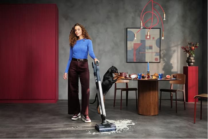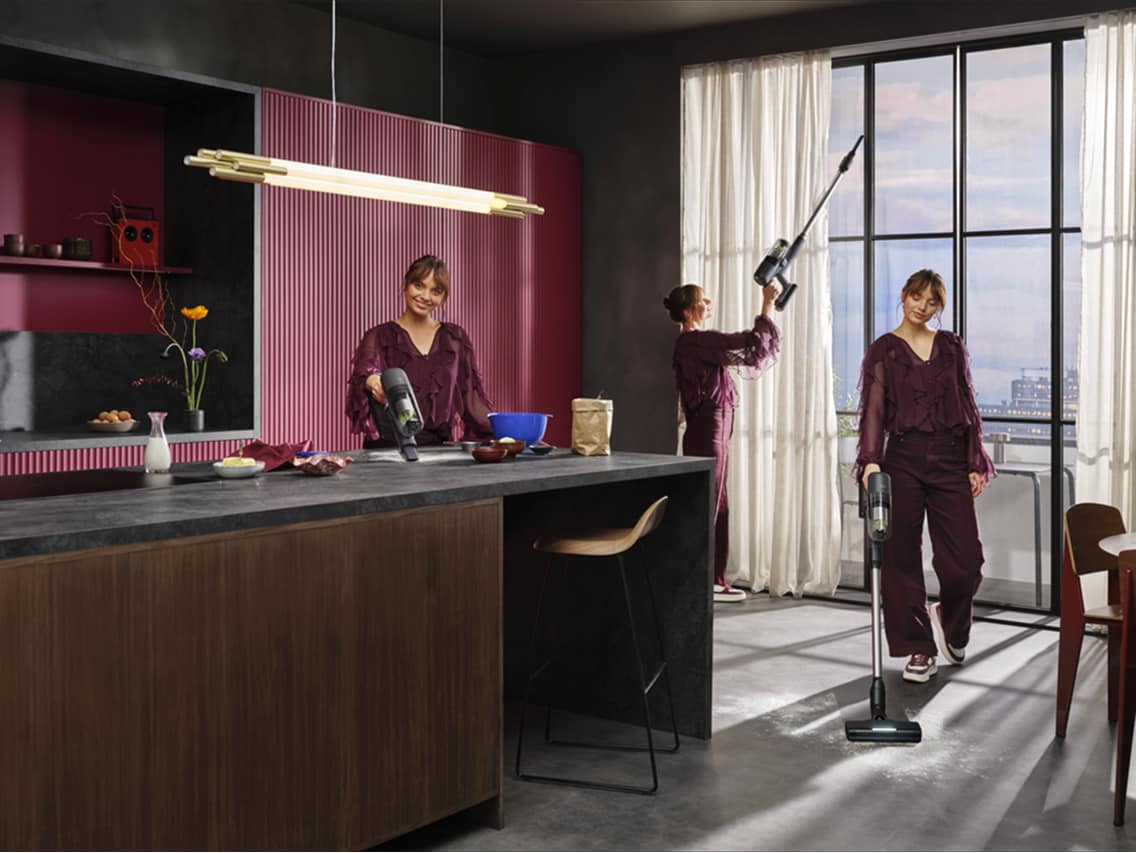³ Autonomie mesurée en mode haute vitesse. Aspiration de la poussière testée conformément à la norme CEI 62885-2, en tenant compte du résultat moyen d'aspiration de la poussière 5.2, 5.3 (dans les deux sens) sur sols durs. Résultats basés sur une comparaison avec les six aspirateurs balais les plus vendus, au prix supérieur à 490 €, dans quatre pays européens (octobre 2024 à septembre 2025).