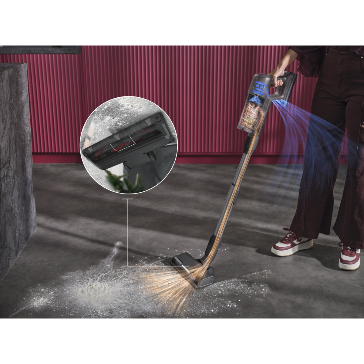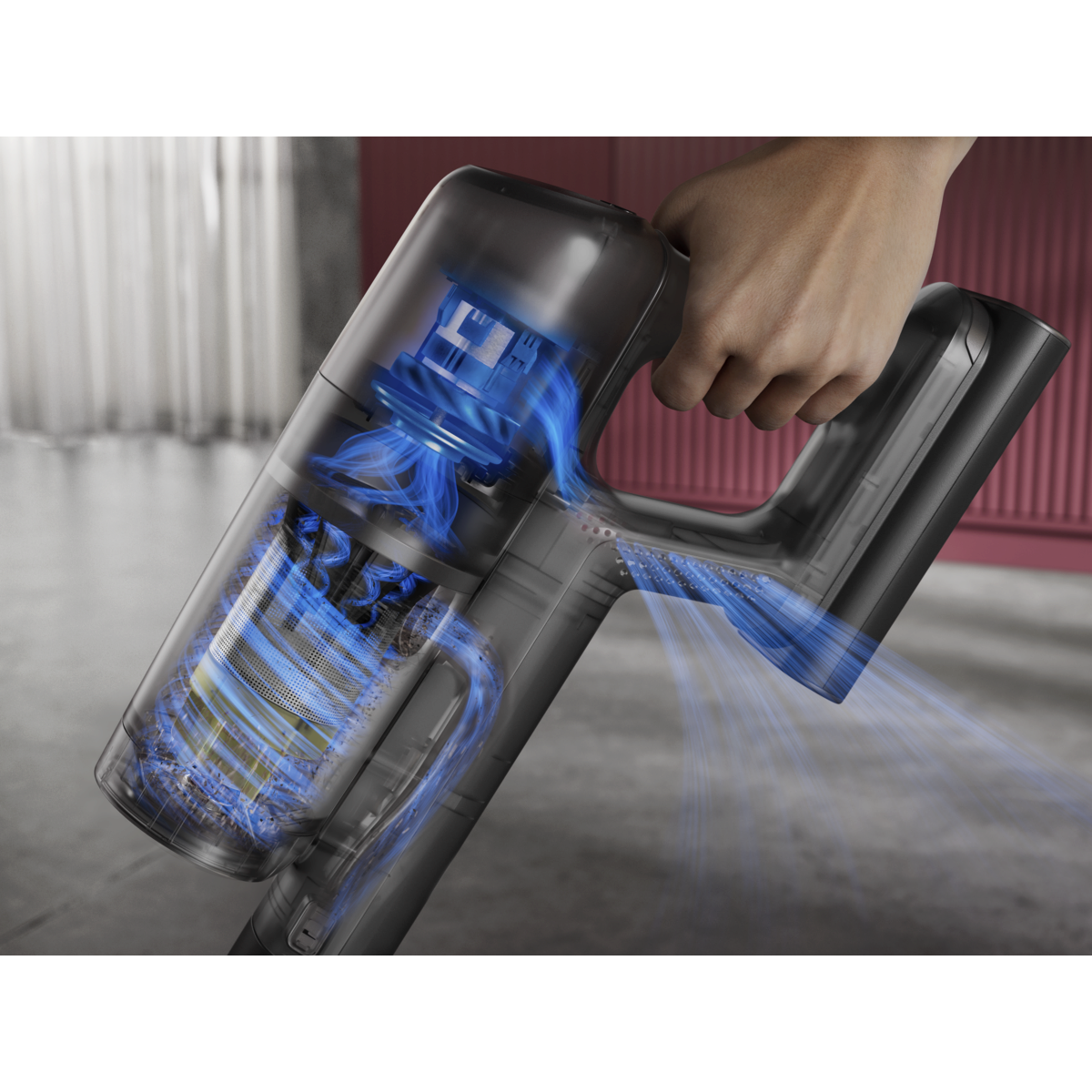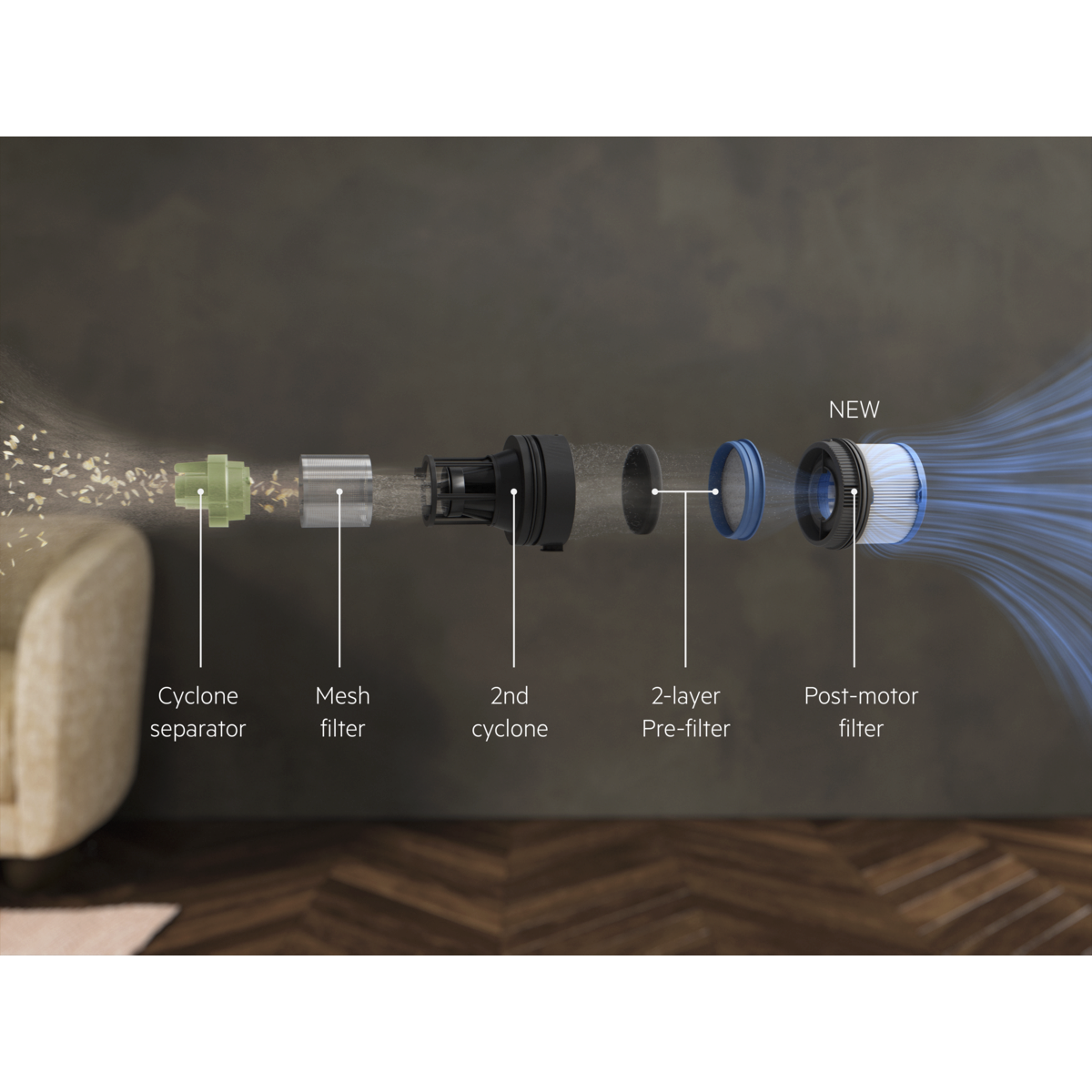 *Par rapport à un moteur monocyclonique dans les aspirateurs sans fil. **Basé sur un test interne réalisé conformément à la norme IEC 62885-4.